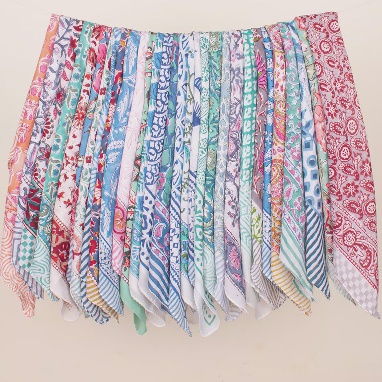 Presenting our Set of Set of 55 - Organic Block Printed Bandana, Handmade Wrap, all created by hand with block prints. Every piece is a little different, not the same like machine cloth. These Printed Cotton Bandana are handy for daily wear, gifting, or even shop display. Nothing fancy—just plain cotton work made with effort. The cotton is totally organic & lightweight so you can wrap around your neck, tie it on your head, or just keep it as a scarf. Colors and prints bring a simple boho style.